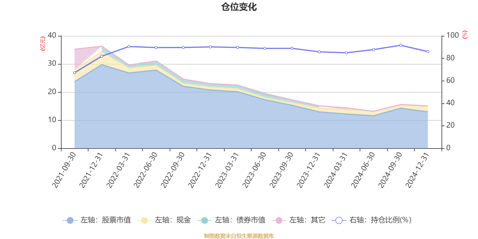 据定期报告数据统计,近三年平均股票仓位为88.63%,同类平均为87.17%。2024年三季度末基金达到91.65%的最高仓位,2021年三季度末最低,为67.22%。