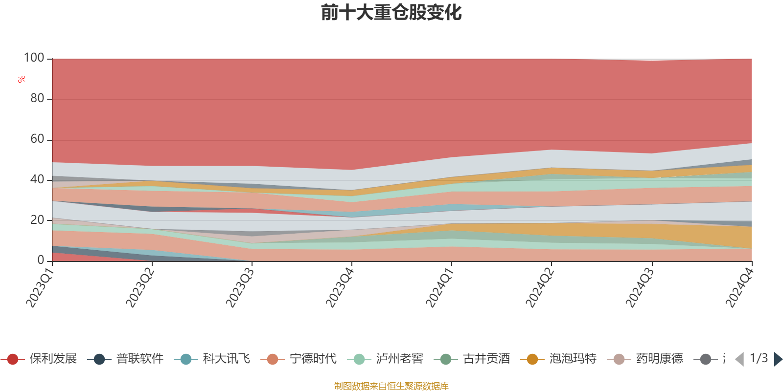 截至2024年四季度末,基金十大重仓股分别是泡泡玛特、腾讯控股、贵州茅台、美团-W、宁德时代、中际旭创、金山办公、恺英网络、分众传媒、五粮液。